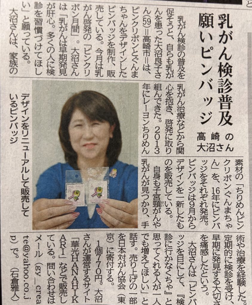 本日の上毛新聞(群馬県県央)にピンクリボンピンバッチについての記事を載せていただきました。